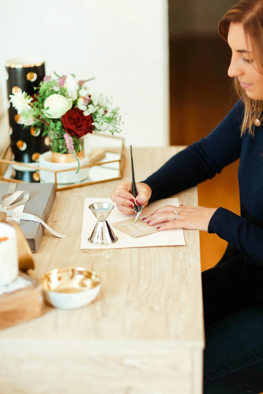 Try putting together a basket of thoughtful items your hostess would love to relax to after their party such as wine, chocolates, a hand poured candle, coffee beans from a local roaster, artisan marshmallows and drinking chocolate, and fresh flowers. Try simply adorning the items and hand dyed throw blanket with a silk ribbon and adding them to a basket that your hostess can reuse. To add a personal touch handwrite a thank you note to attach to the basket! Enjoy!