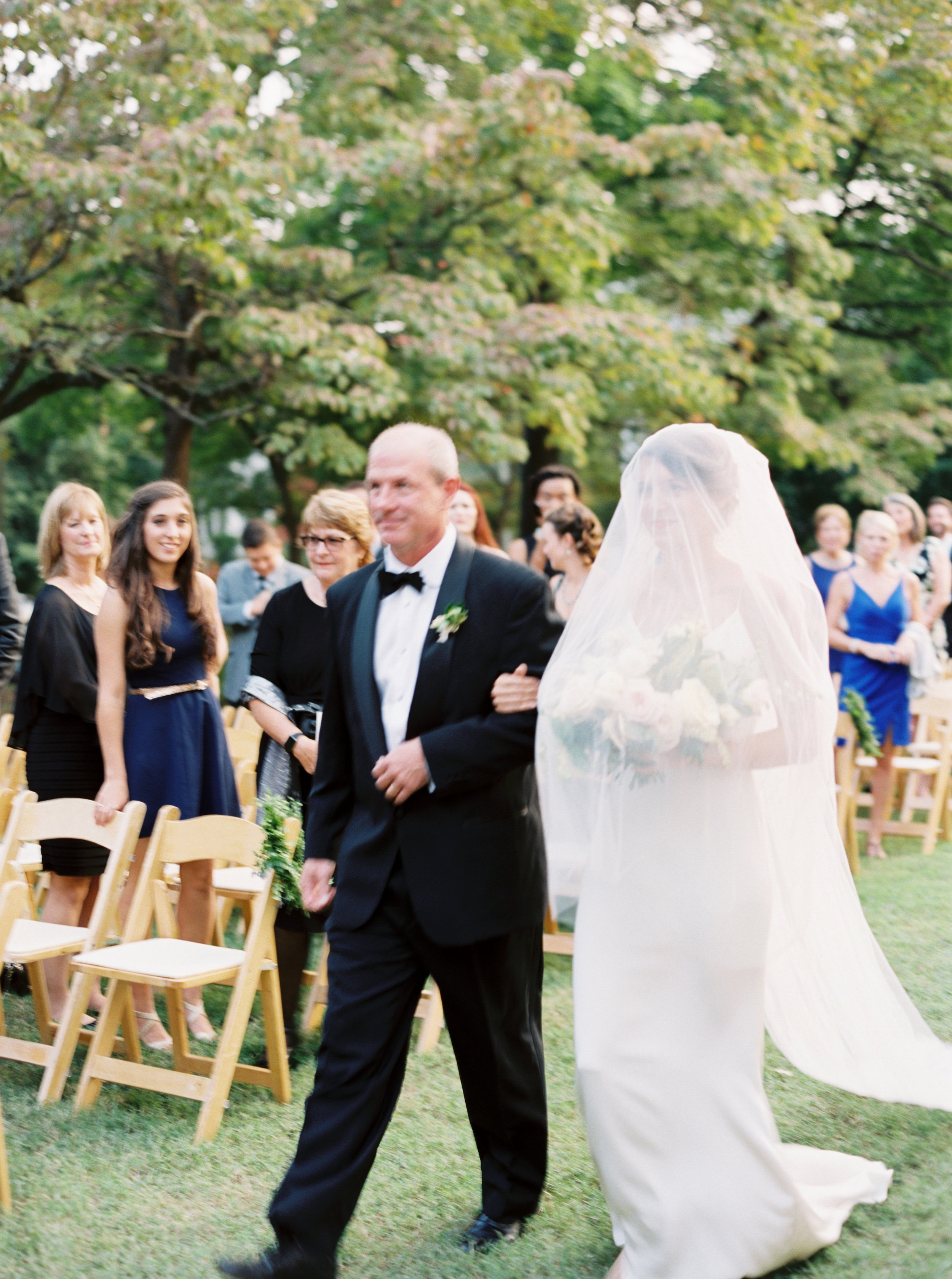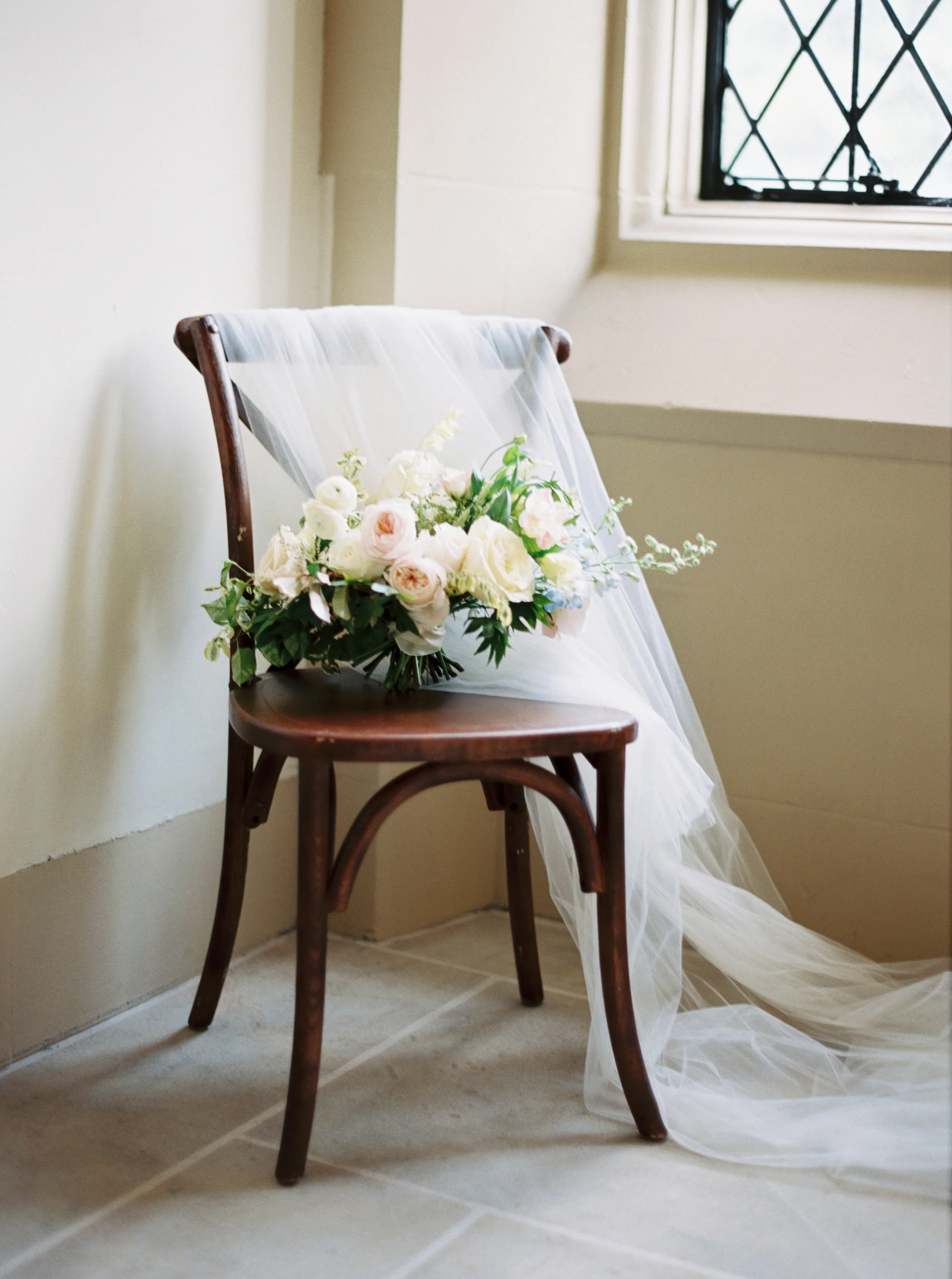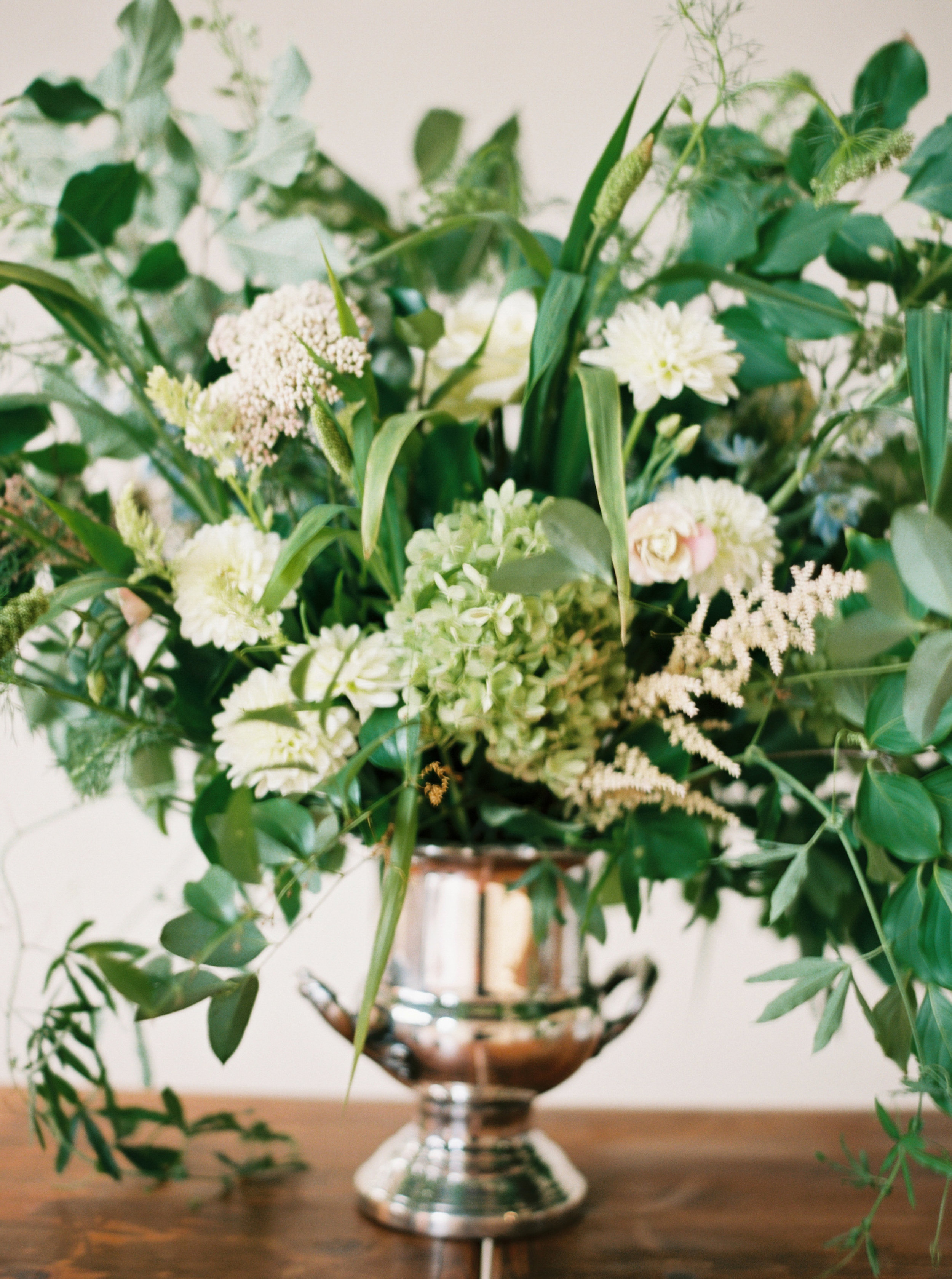 The result of their combined tastes created an atmosphere that was elegant while still maintaining warmth and comfort for their guests to enjoy. The couple said their vows on the grounds of the Branch Museum of Architecture and Design in Richmond, Virginia surrounded by family and friends. The stone castle feel of the venue fit perfectly with the delicate floral garlands that draped on fireplaces throughout the building. Silver vases that belonged to the bride’s grandmother sparkled on each of the serving tables, and the wreaths that adorned to ceremony aisle transitioned nicely as center pieces for the dining tables in the great hall.